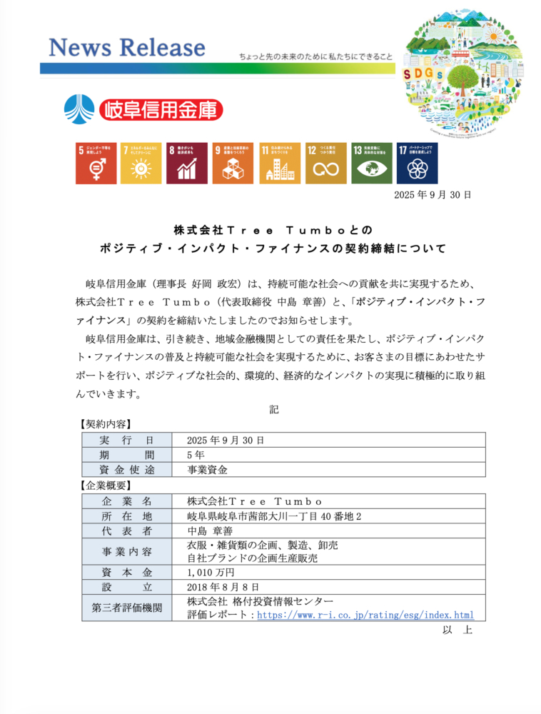 この度、株式会社Treetumboは、岐阜信用金庫より「ポジティブ・インパクト・ファイナンス」による融資を受けましたのでお知らせいたします。ポジティブ・インパクト・ファイナンスとは、企業活動が環境・社会・経済へ与える影響を総合的に評価し、持続可能な社会の実現に資する企業に対して実行される融資です。SDGs(持続可能な開発目標)の観点から、事業の社会的意義や将来性が評価される取り組みとして位置付けられています。当社は、アパレル・雑貨の企画製造やブランド立ち上げ支援、OEM企画から販売までの一貫したサポートを通じて、地域産業およびクリエイター支援に取り組んできました。また、小ロット生産や過剰在庫の削減、リメイク・再活用など、環境負荷低減を意識した持続可能なものづくりを推進しています。さらに、多様な働き方を尊重した柔軟な職場環境づくりにも取り組み、企業活動を通じて社会にポジティブな価値を生み出すことを目指しています。これらの取り組みが評価され、今回の融資実行に至りました。今後も株式会社Treetumboは、クリエイティブとものづくりの力を通じて、地域社会および次世代に貢献する企業として、持続可能な事業活動を推進してまいります。